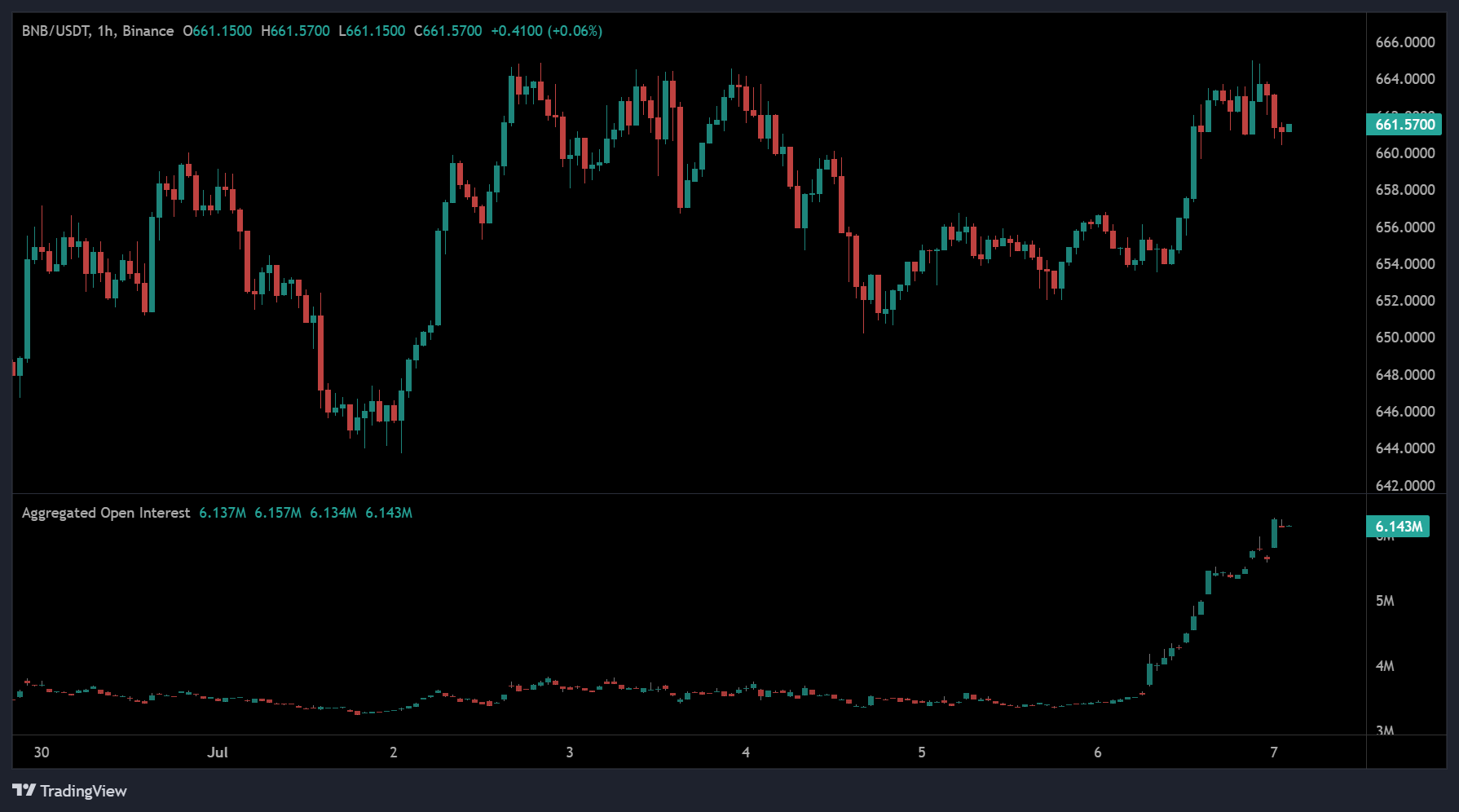 The 1-hour BNB/USDT chart displays a short-term breakout from the $648 region, with the price surging past $664 before encountering resistance. Despite retracing slightly to $661.57, BNB continues to hold the breakout level, forming a higher base that suggests buyer interest remains intact. The structure indicates a bullish shift in sentiment after a prolonged period of sideways movement and minor pullbacks that defined the earlier part of July.