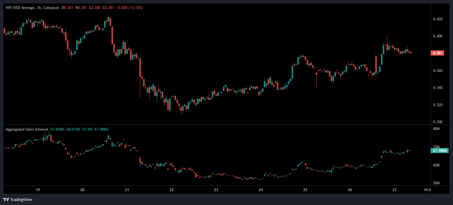 Market data from BraveNewCoin places WIF at $0.38127, reflecting a 4.26% increase over the past twenty-four hours. The token’s market capitalization sits at approximately $381 million, with daily trading volume reaching $165 million.
