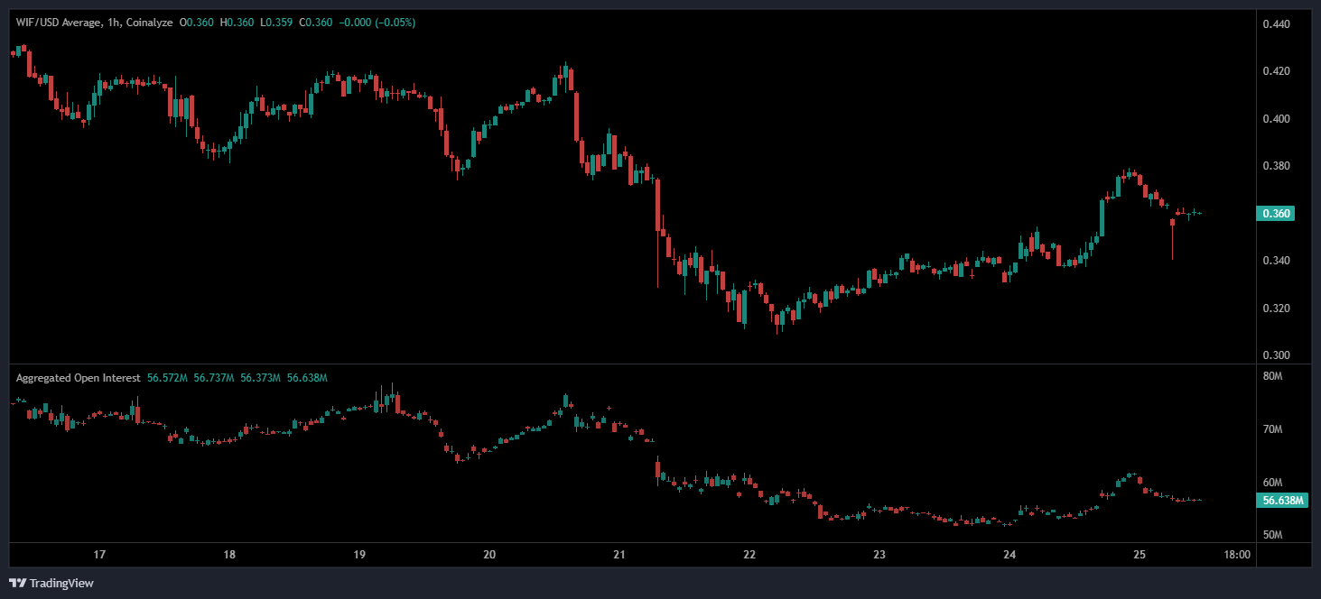 At the time of writing, WIF/USD trades around $0.360, showing little net change as the market enters a tight consolidation range following an extended decline.