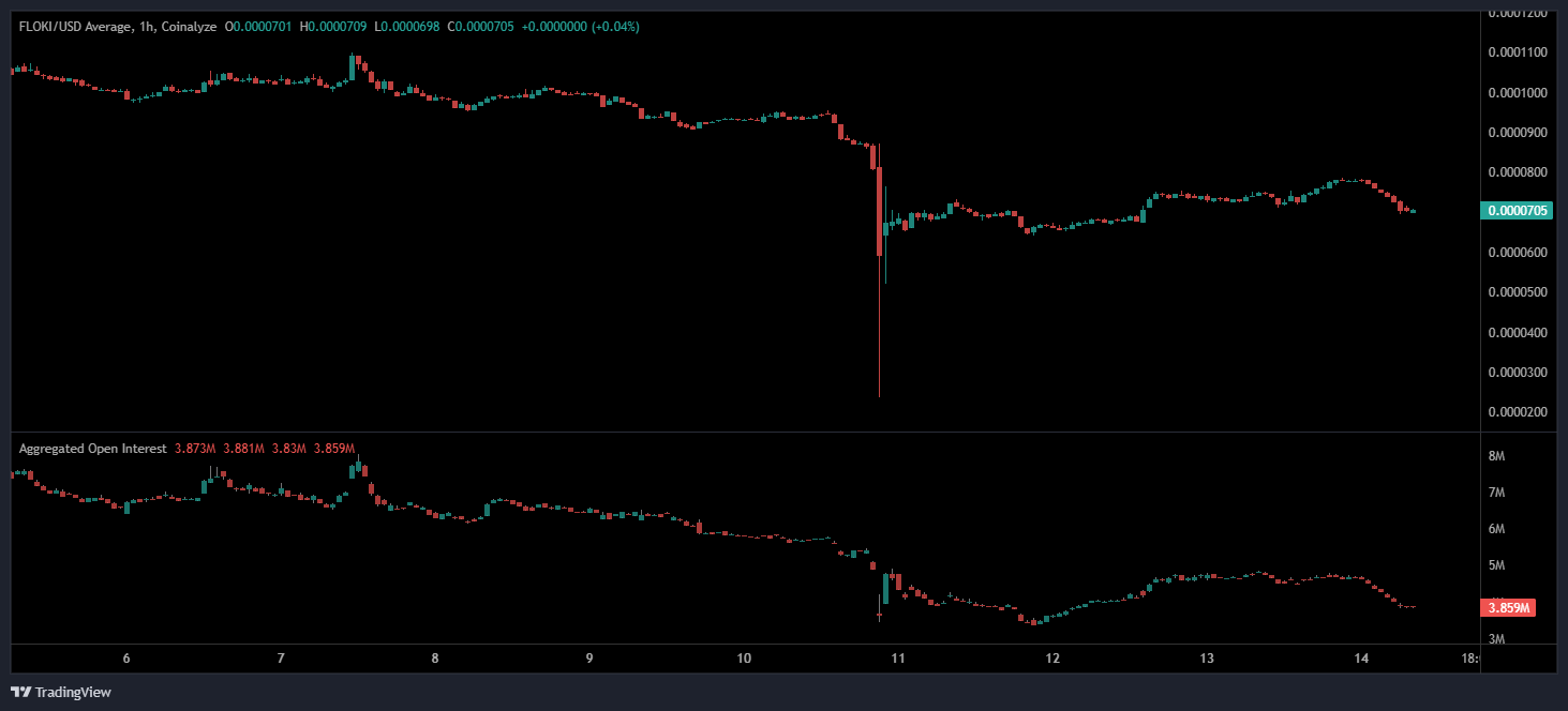 At the time of writing, FLOKI was trading at approximately $0.0000705, recovering slightly after a steep sell-off earlier in the week. According to aggregated derivatives data, open interest dropped from around 3.88M to 3.85M, confirming that several leveraged positions were closed or liquidated during the decline. This reduction highlights reduced speculative activity, as traders retreat to the sidelines following heightened volatility.