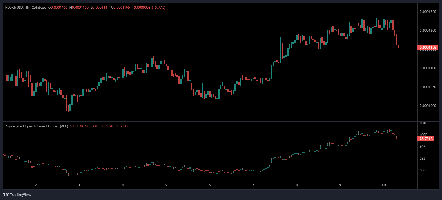 Floki price experienced a marked uptrend starting around early August, with a series of gains pushing the value to recent highs near $0.00013. This trend was supported by increasing market interest, as evidenced by the parallel rise in aggregated open interest in derivative contracts, which typically signals new money backing the rally and sustained market participation.