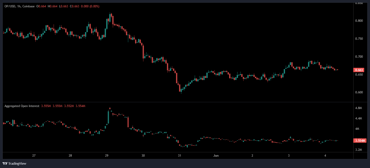 The 1-hour OP/USD chart on Open Interest shows that the token entered a strong bearish phase beginning around May 28. The price declined rapidly from above $0.80 to the $0.63–$0.66 range by May 30.
