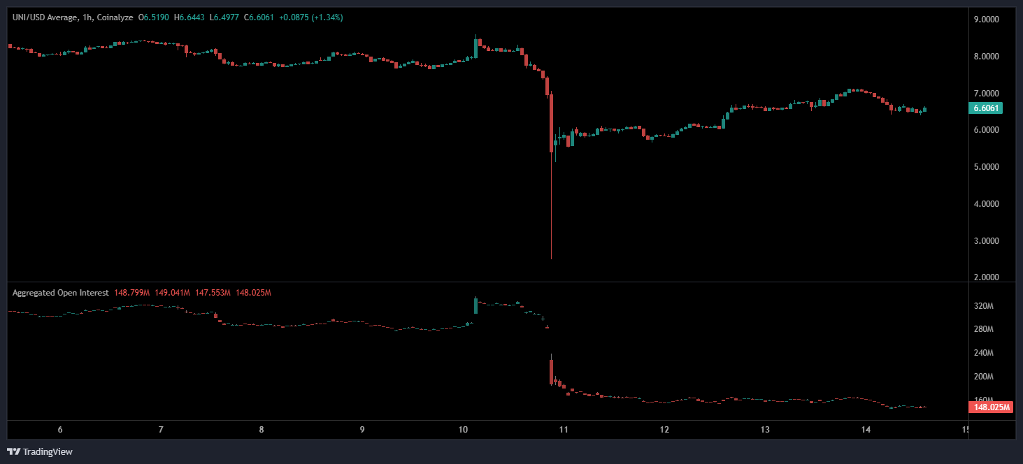 At the time of writing, UNI/USD traded around $6.61, showing a modest 1.34% rebound on the hourly chart after heavy intraday pressure. The decline in aggregated open interest from approximately $149 million to $148 million occurred alongside the sharp selloff, signaling widespread position closures and liquidations among over-leveraged participants.