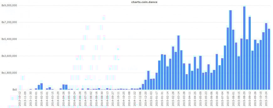 In an effort to find a store of value, Venezuelans have turned to the used car market, the value of used cars is climbing, along with the volume of bitcoin trade. LocalBitcoin.com data shows that trading volume in the Venezuelan Bolivar has increased dramatically since the start of 2014.