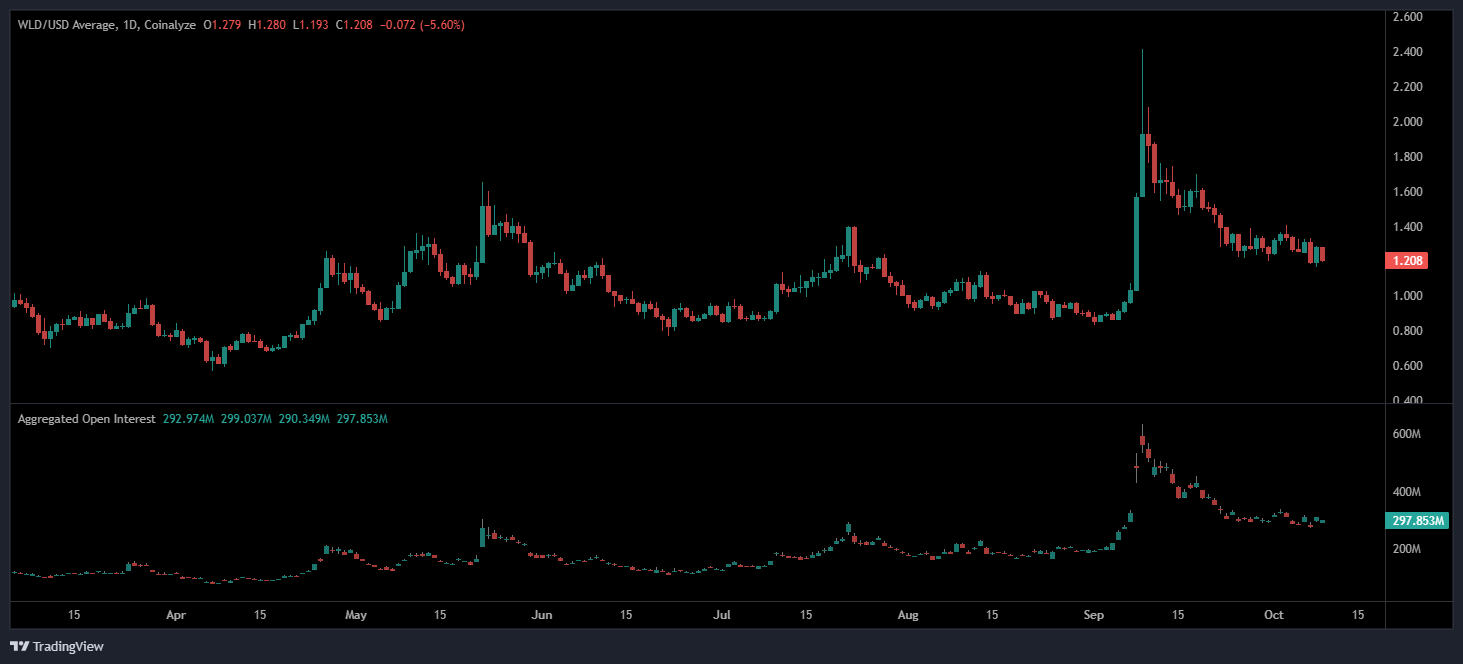 On the other hand, data from open interest metrics provides additional insight into the coin’s current phase. The daily WLD/USD chart shows that after a sharp spike above $2.40, price action swiftly retraced, forming a descending pattern that brought the token back toward $1.20.